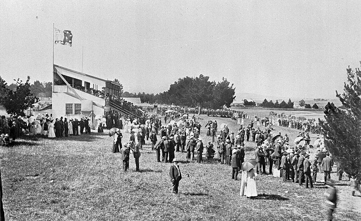 The opening of the railway line to the racecourse from the main Adelaide line (about 5 kms north of the course). Note the Australian Natives Association (ANA) flag flying from the grandstand.