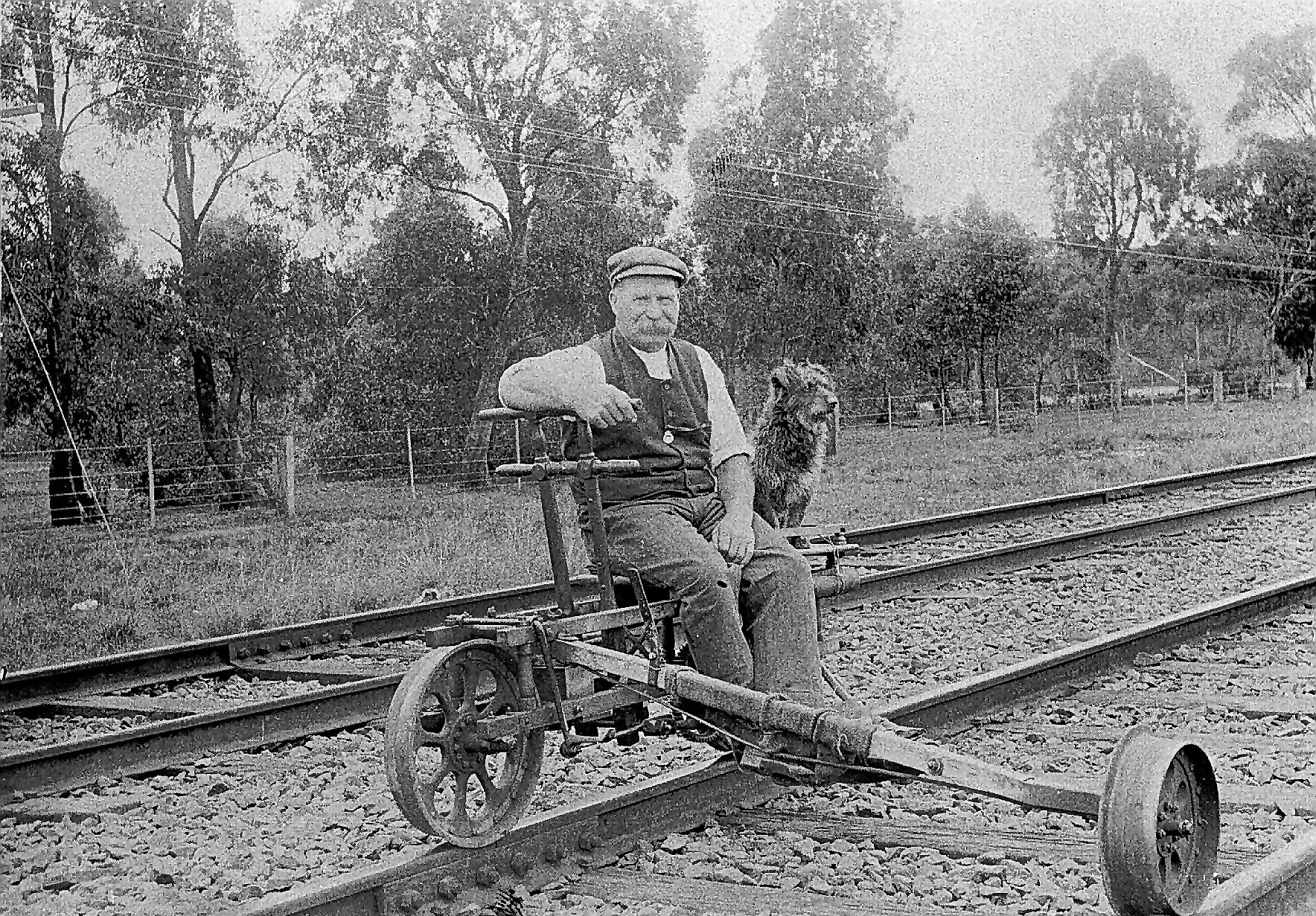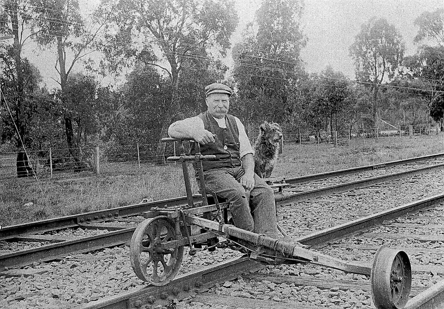 A railway staff member and a dog sitting on a ganger's trolley. This man was probably an employee of the Ways and Works branch of the railways.