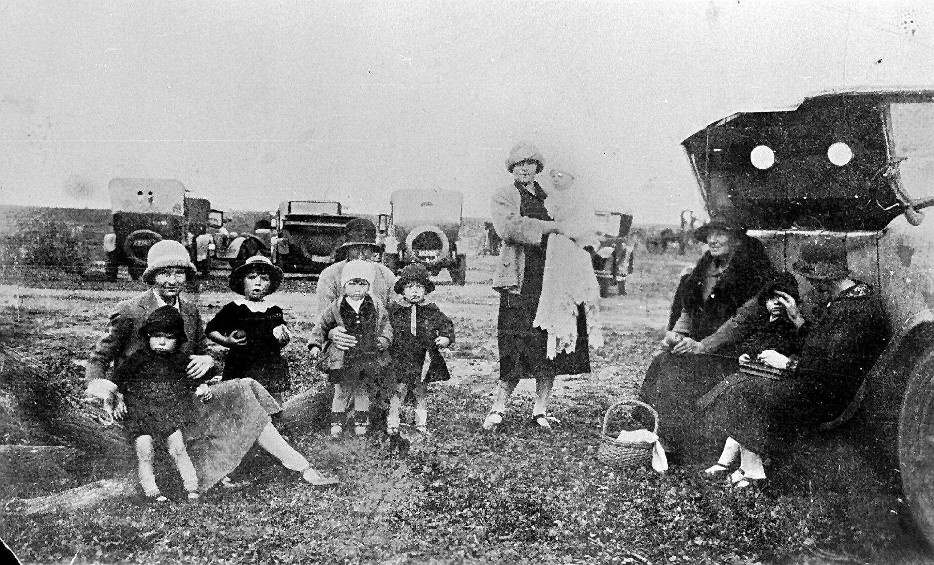 Farming families posed with their cars during the visit of the Better Farming Train. Five women and six children are sitting and standing near a car. A basket at their feet suggests they may have been having a picnic.