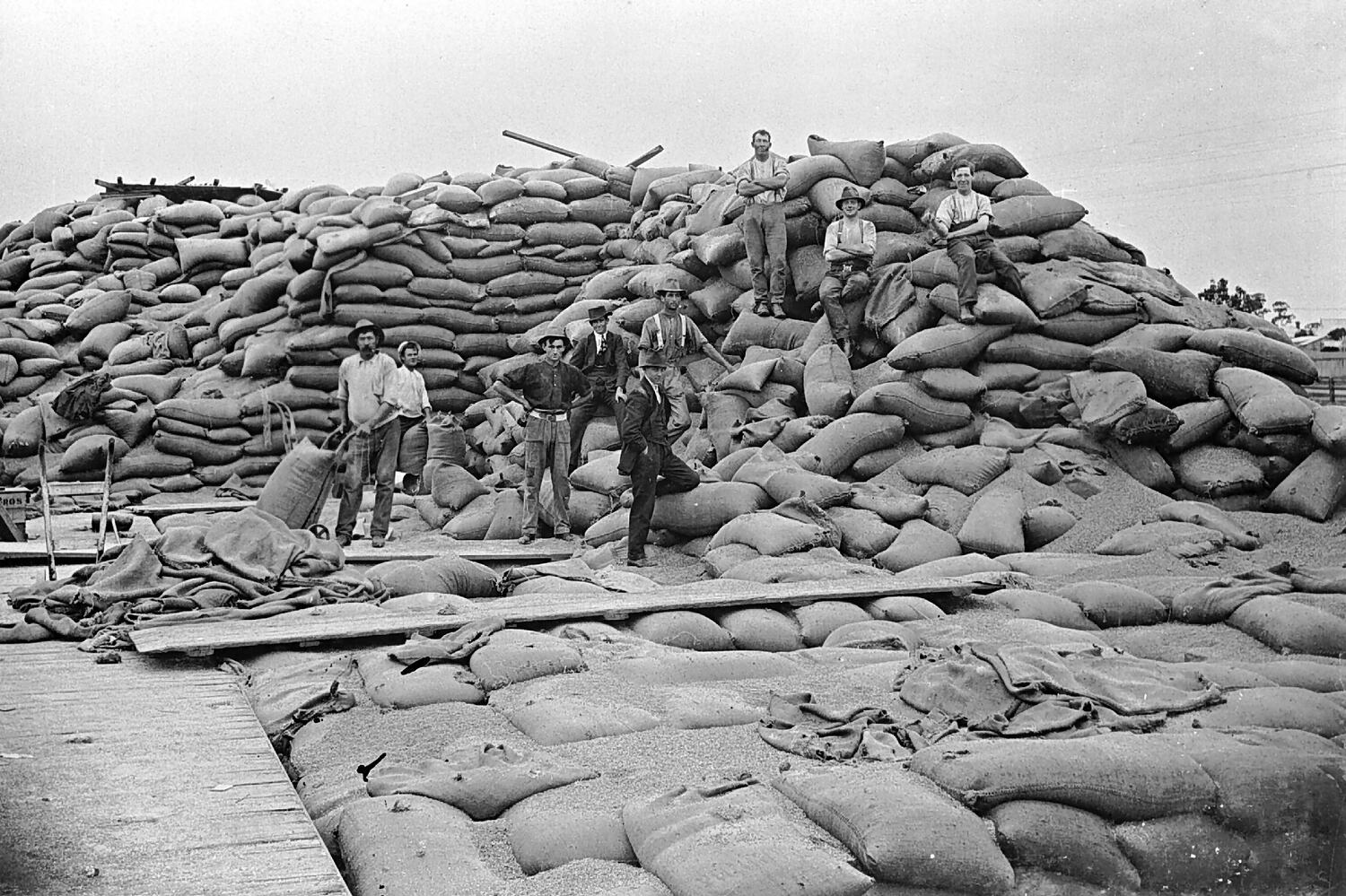 Men posed whilst working on a wheat stack that had been damaged by a mouse plague. They are moving bags with trolleys. The stack was in the Warracknabeal rail yards.