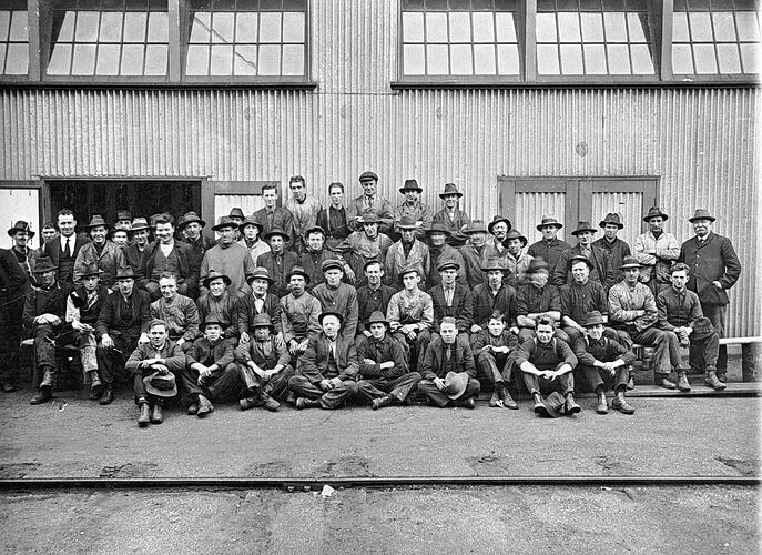 Shop erection workers posed for a group portrait at the North Ballarat railway workshops. They are posed outside a corrugated iron building with large windows.