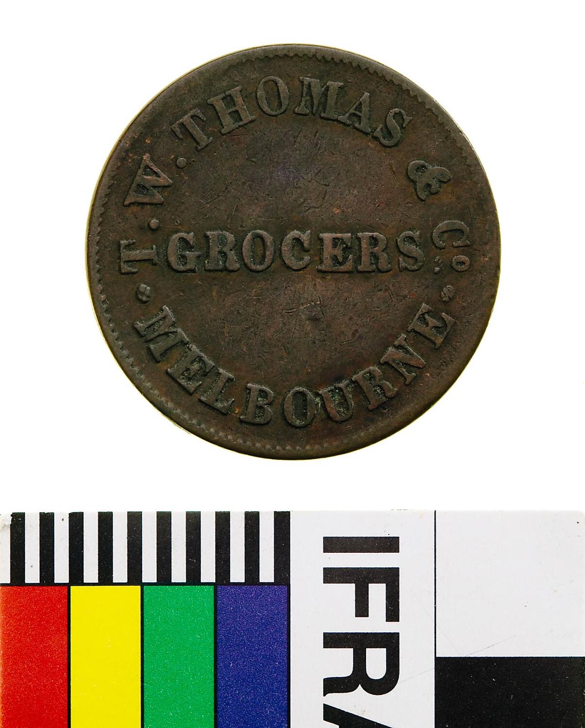 A copper halfpenny trade token (28 mm diameter). It features the name and business of the issuing firm: T.W. THOMAS & Co., grocers Melbourne and commemorates on the reverse the arrival of Sir Charles Hotham on 22 June 1854.