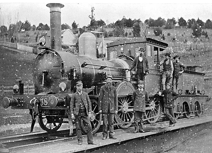 Railways station staff and train crew posing with a Victorian Railways F-class 2-4-0 type passenger steam locomotive on the turntable in the Daylesford Station yard, probably while the engine was being turned for a return trip to either Woodend or Ballarat, where F-class engines were based. The engine was built by the Phoenix Foundry Co., Ballarat, in about 1879, and appears to be Victorian Railways locomotive No.182 (although it may be no.180 or 184 - the number of the front buffer beam being partially obscured).