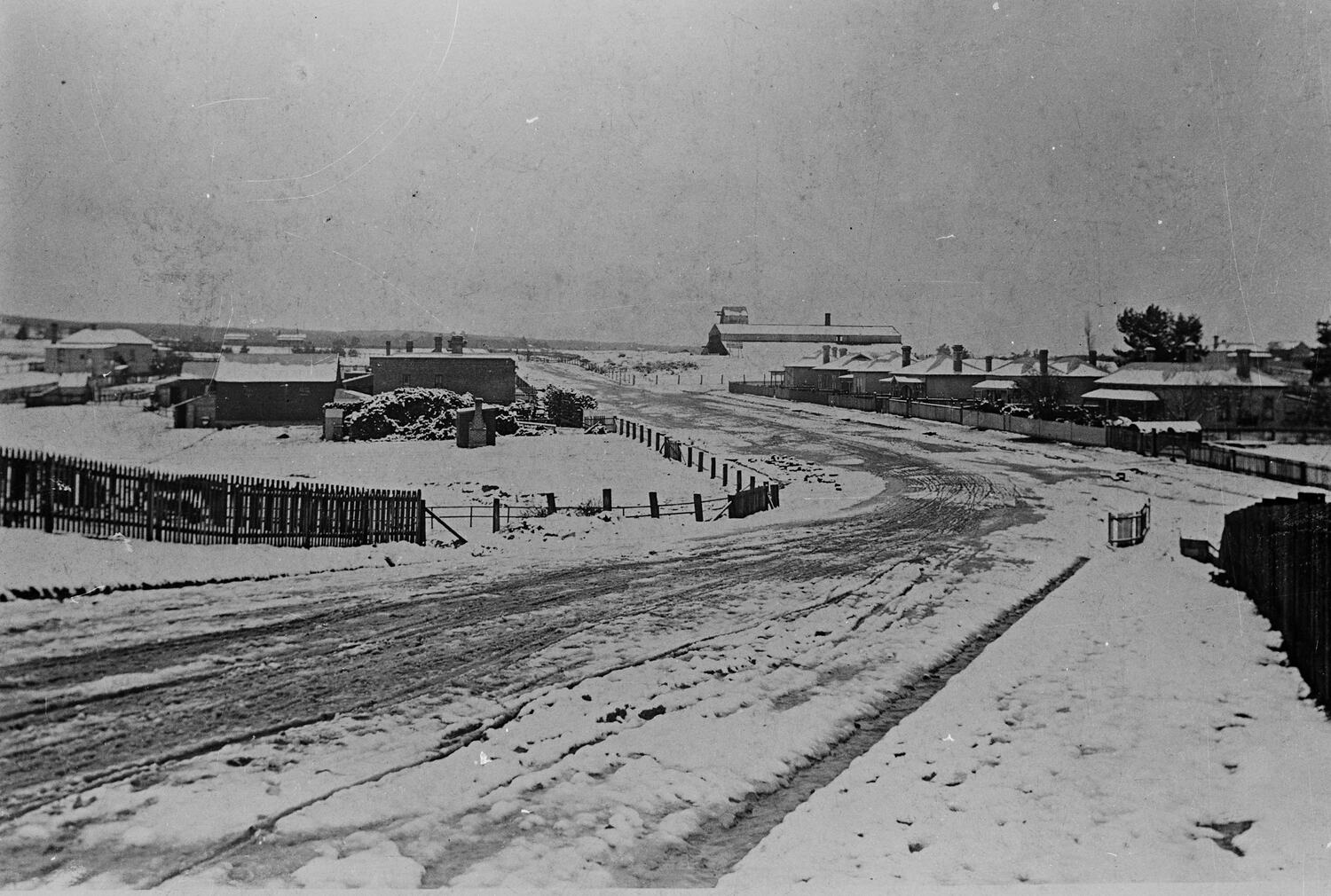 Cowley's Eureka Ironworks & Foundry (in background at right) and the goods shed of the East Ballarat-Melbourne line under snow on Christmas Day, 1901. Several houses are also visible.