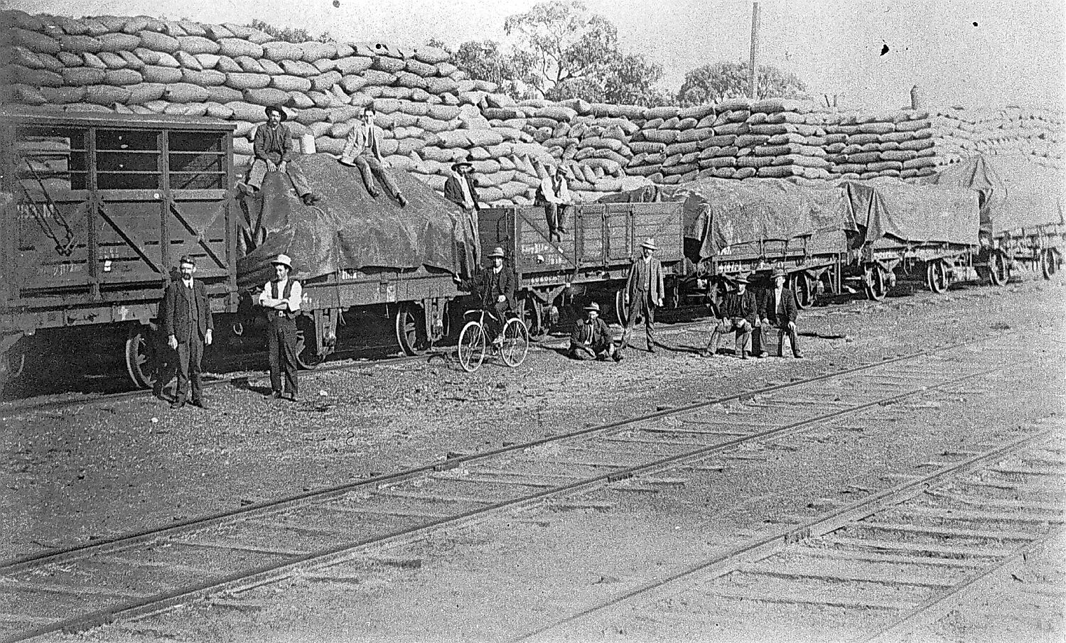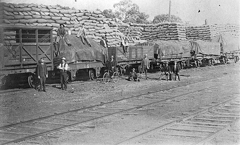 A team of contract grain workers posed with rail trucks and wagons. Several large stacks of bagged wheat are visible behind the train, and some of these bags have been loaded onto the goods trucks. The man of the far left may be wearing a railways staff uniform. Another man poses on a bicycle. Most of the loaded wagons have been covered with tarps.