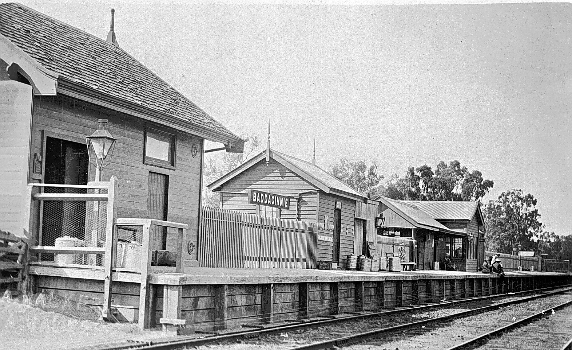 General view of Baddaginnie Railway Station - a series of small timber buildings on an elevated platform. Several people are visible sitting on the platform. Two railway lines can also be seen. A lampost is positioned at either end of the platform.