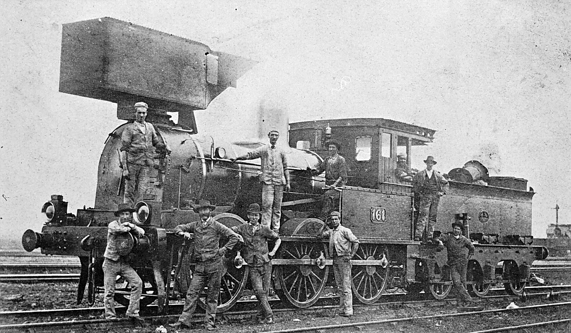 A group of men, including some railways staff, posed around the old R-class 0-6-0 type steam locomotive No.161. The R-class were goods locomotives built by Phoenix Foundry, Ballarat, between 1881-1886. The locomotive has been fitted with a smoke deflector (the large 'box' mounted on its front).