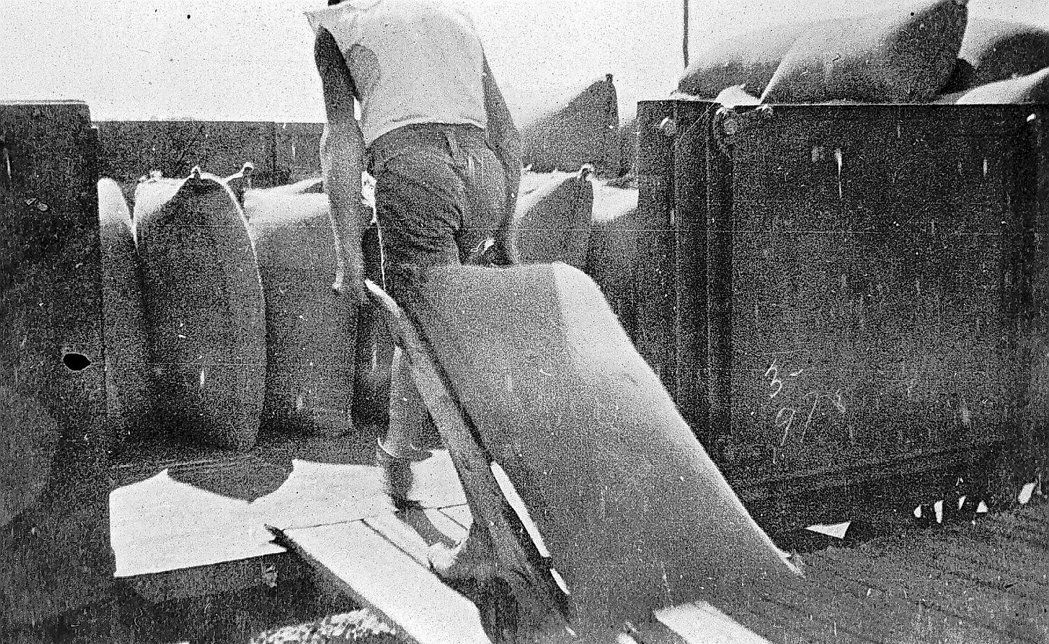 A man loading bagged wheat onto a goods truck at Nyarrin Railway Station. He is using a trolley to carry the bag up a ramp into the goods truck.