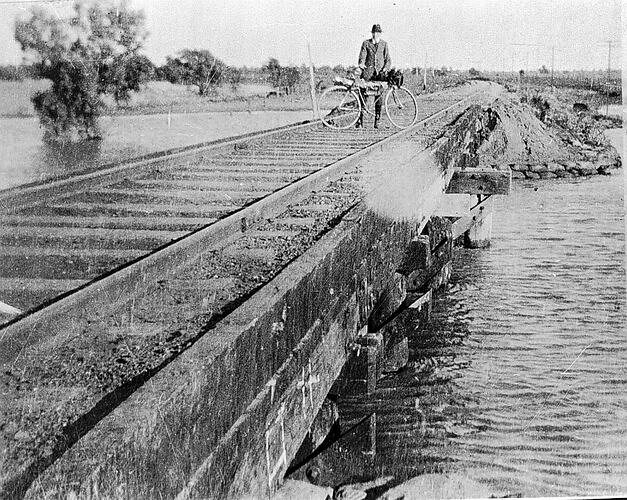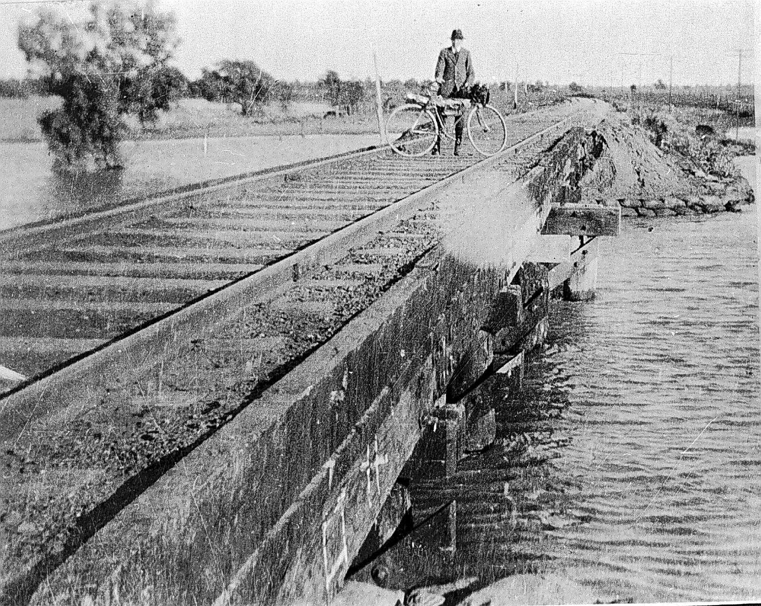 A man with a bicycle posed on a railway bridge. The river waters are quite high - this was possibly during a period of flooding. A partially submerged tree is visible in the background.