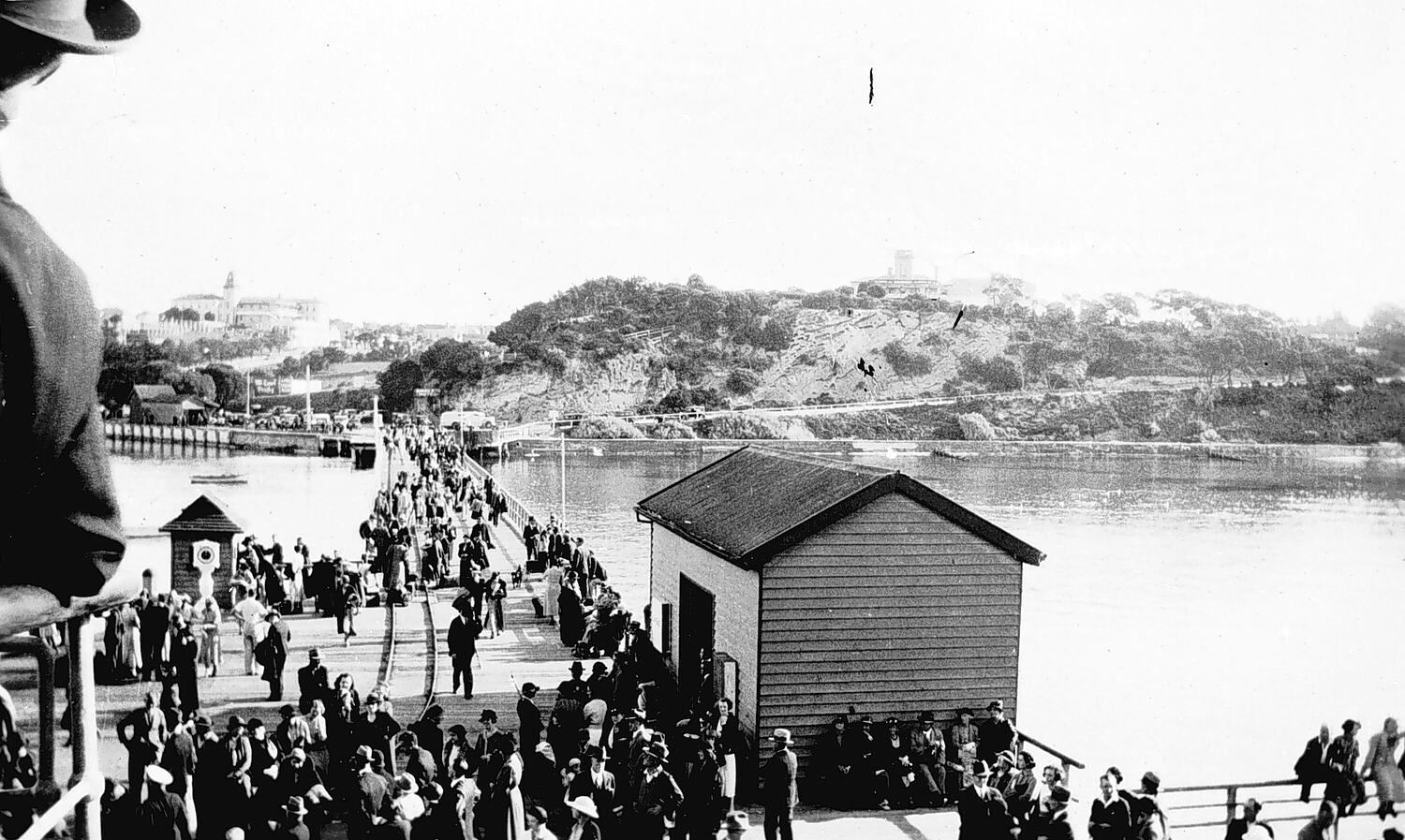 Groups of people on Sorrento Pier seen from seaboard. There are railway lines along the pier.