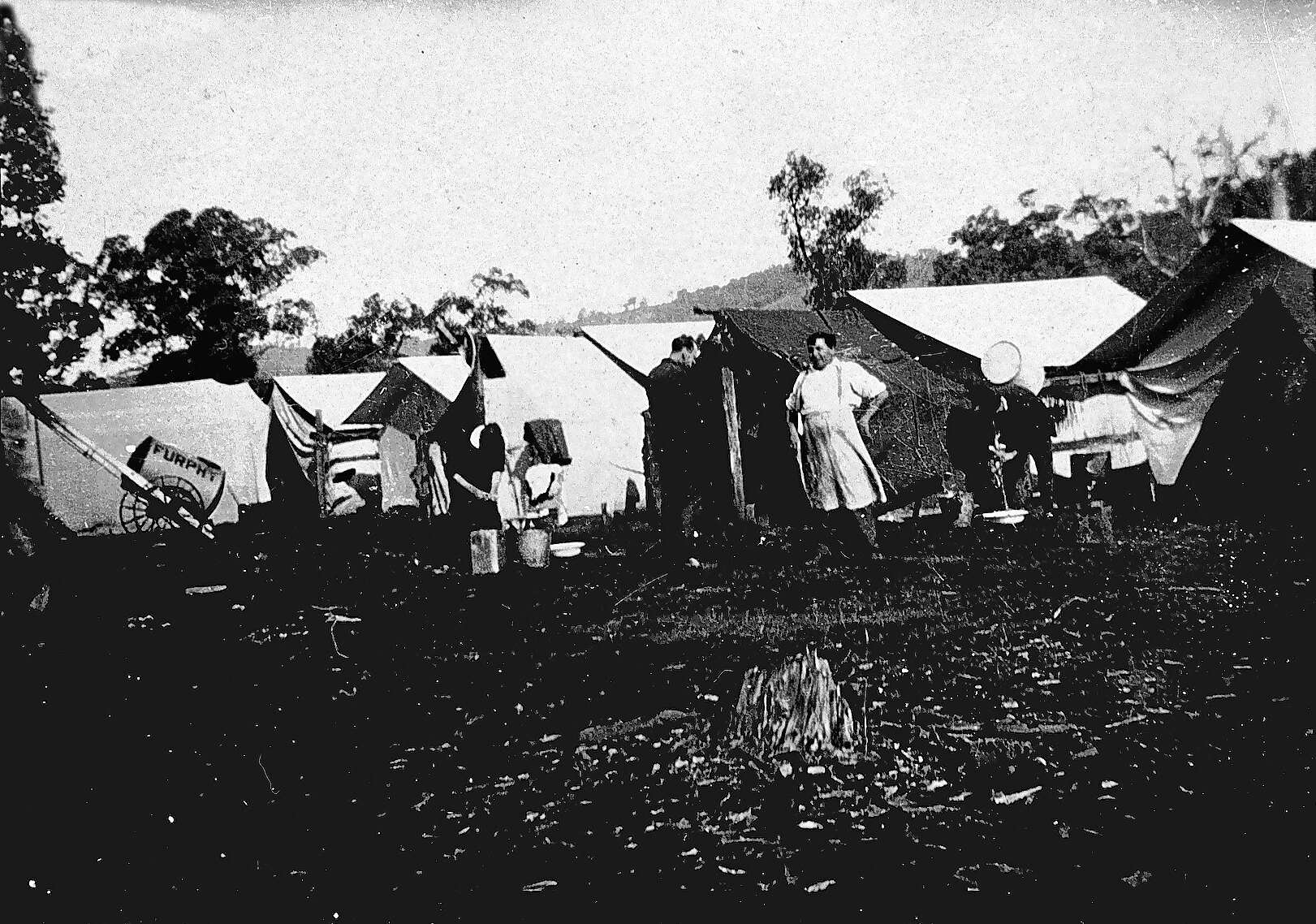 A railway survey camp for the proposed Casterton to Narracoorte railway. The camp was in the Barr Road Reserve, five miles from Casterton. There is a Furphy water cart on the left.