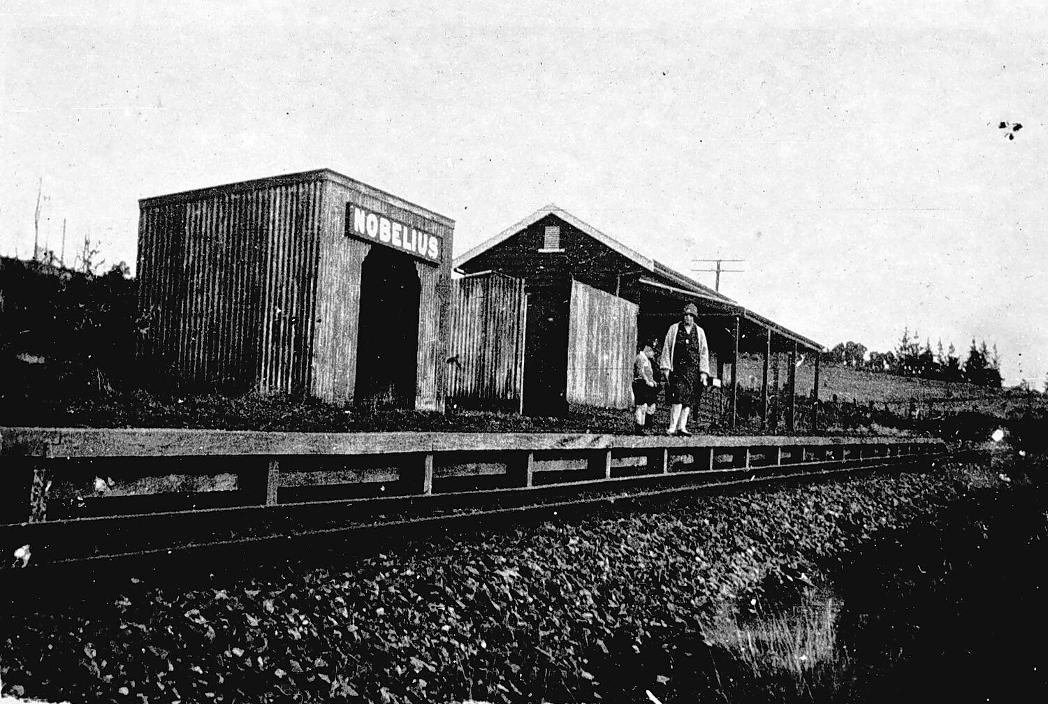 A woman and child waiting on the platform of Nobelius Railway Station. The station buildings include a small corrugated iron building, and a more substantial single-story building with a veranda. A single track runs by the platform.