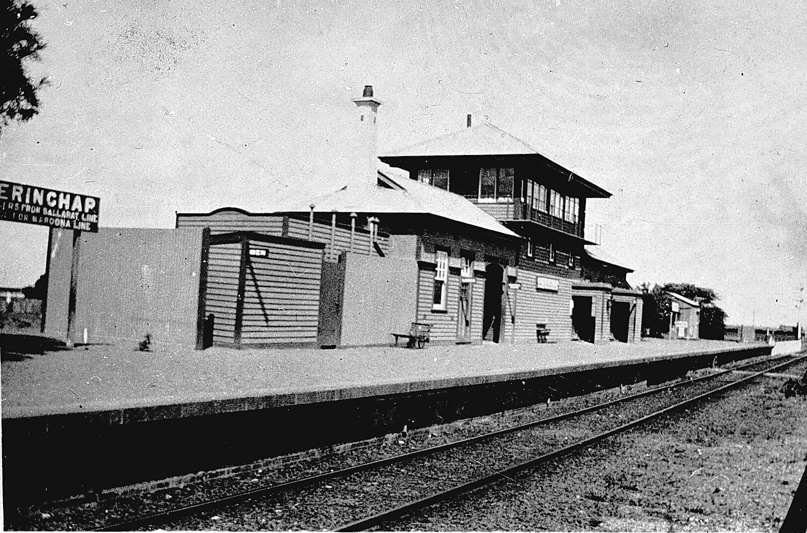 The two-storey timber buildings of the Gheringap Railway Station. The station platform includes several benches and signs indicating the station name. Toilet buildings are also visible.