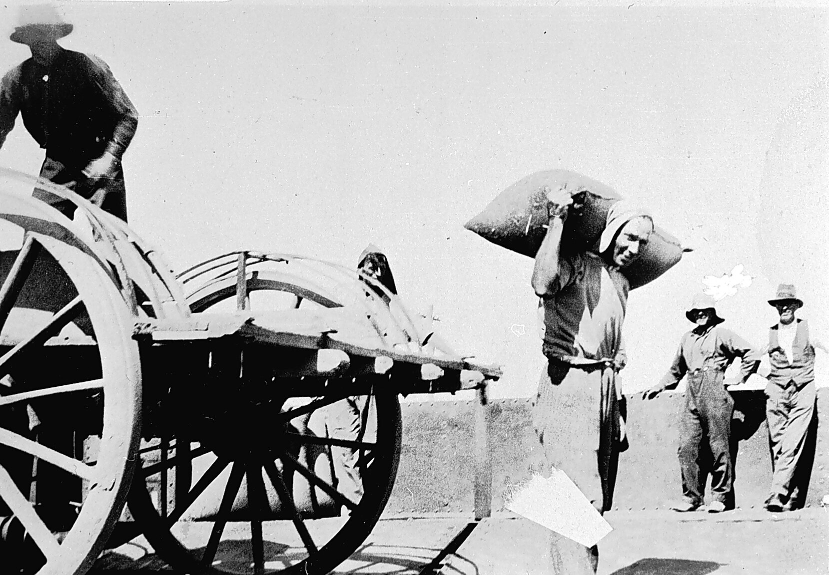 Men unloading bags of wheat at Raywood Railway Station. One man is standing on a cart, whilst another carries a bag on his shoulders. Several other men look on.