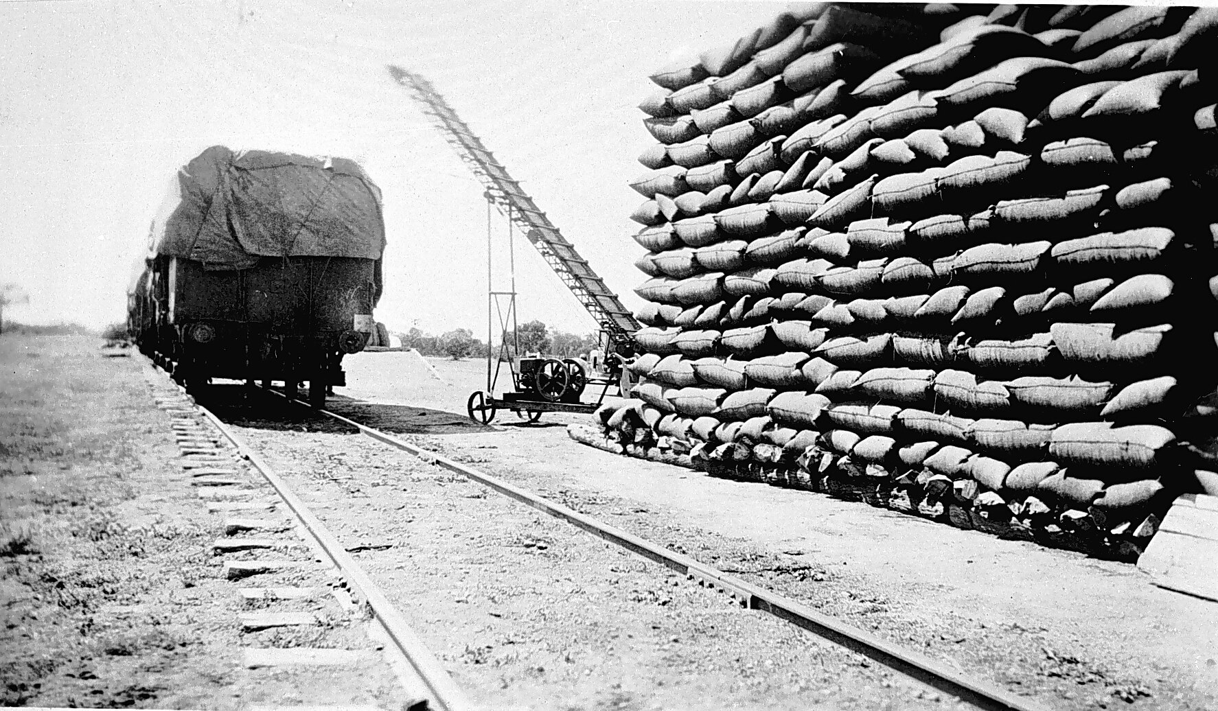 Agricultural Equipment, Bag Handling Equipment, Cereal Crops, Grain Stacks, Railway Lines, Railway Stations, Railway Wagons, Sacks