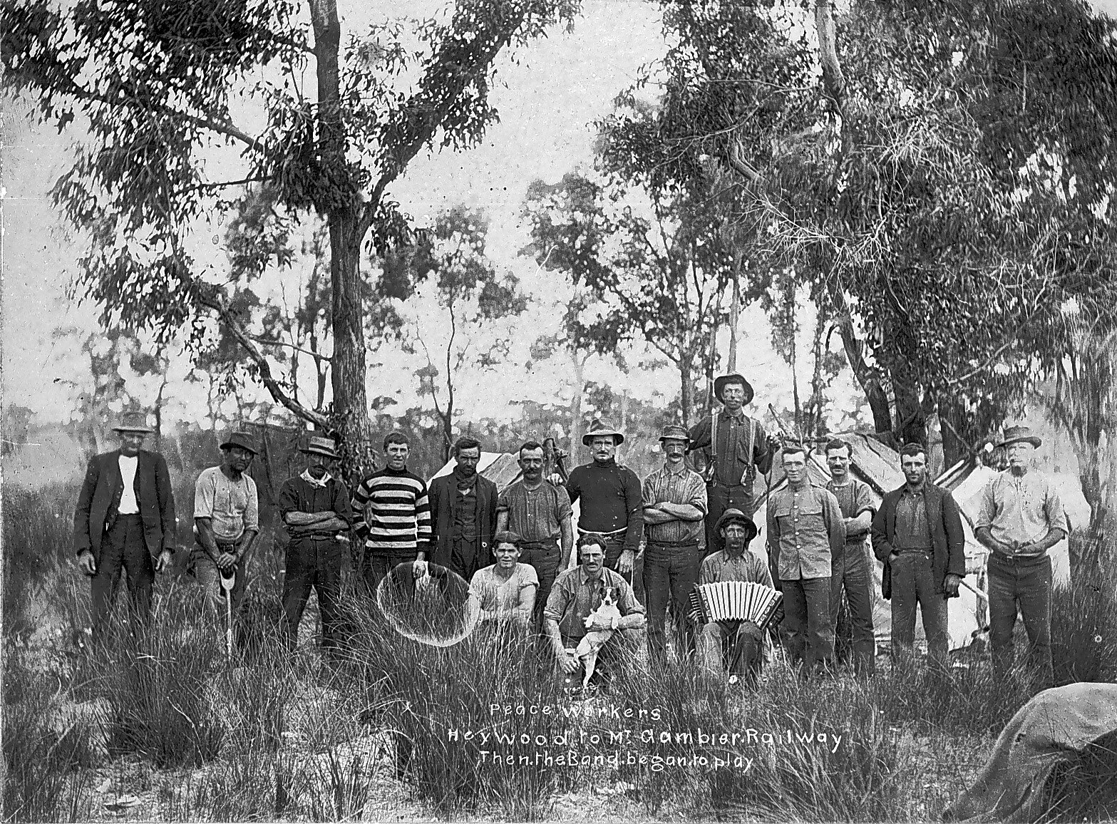 Workmen involved in building the Heywood to Mt Gambier railway at their camp. One holds a dog and one a piano accordion.