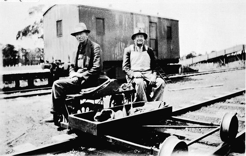 Two railway gangers posed on their ganger's trolley. There is a goods truck and a platform in the background. A ramp, possibly a stock ramp, is positioned beside the railway line.