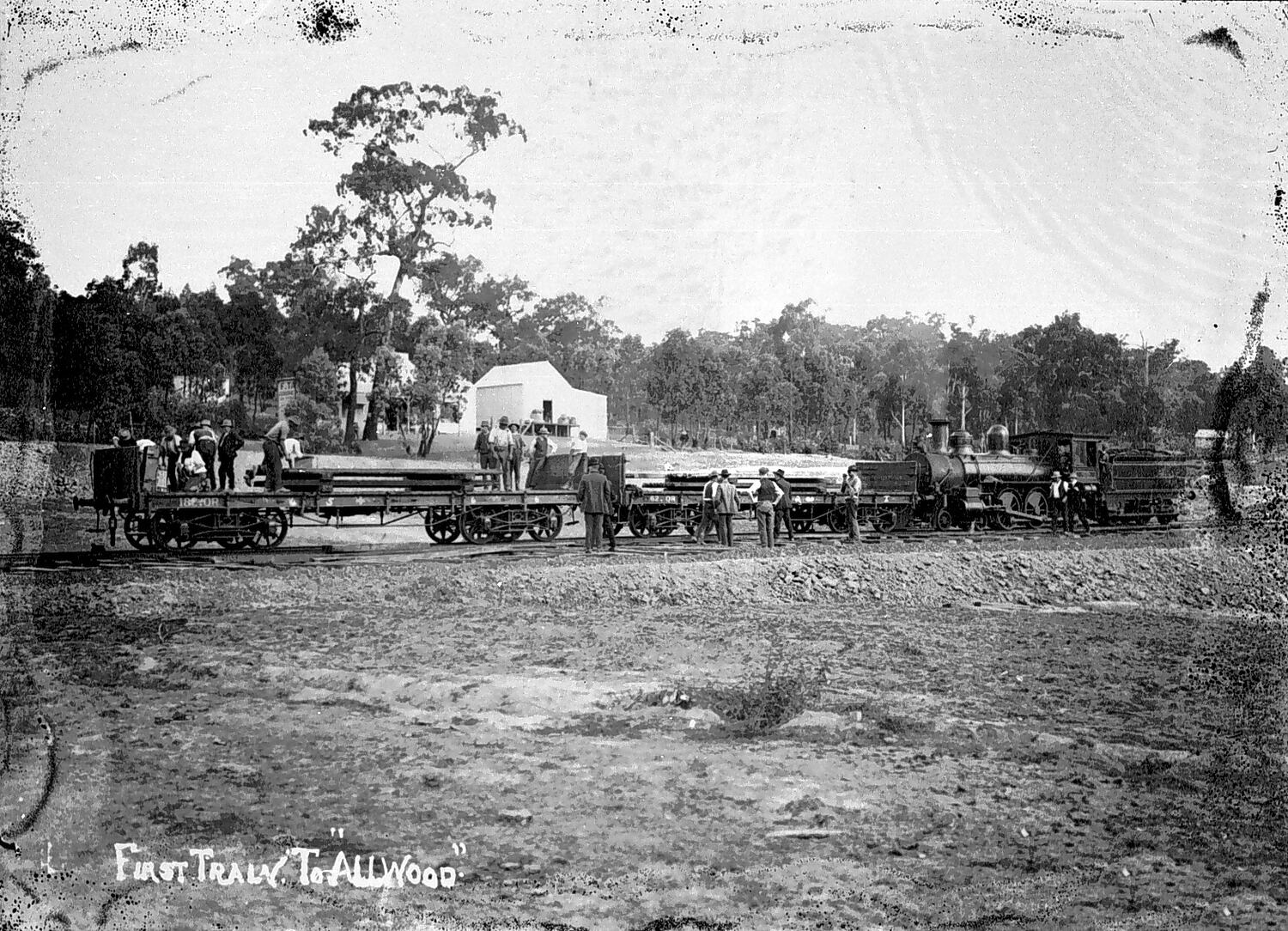 The train is pushing a number of flat bed trucks. Photograph appears to show a Victorian S-class steam locomotive with double- bogie flat trucks carrying sleepers or other timber for railway construction the photograph is believed to depict construction o.