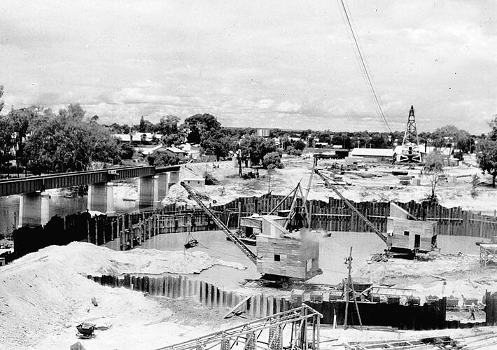 A riverside construction site. There are three cranes working behind a coffer dam. There is a railway bridge on the left Believed to be the Yarrawonga Weir. The railway bridge is the Yarrawonga - Oaklands line which opened in 1938.