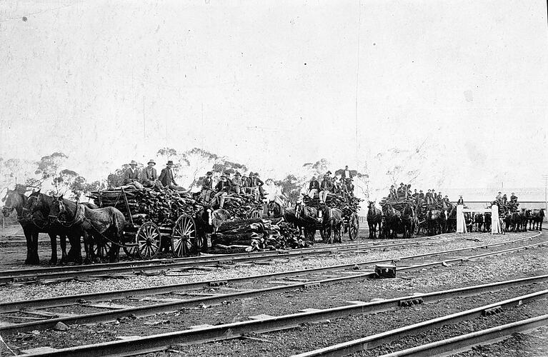 Wagon loads of wood at the Merbein Railway Station. Frederick Russell was the wood contractor. In the background, is the Mildura Co Operative Fruit Company.
