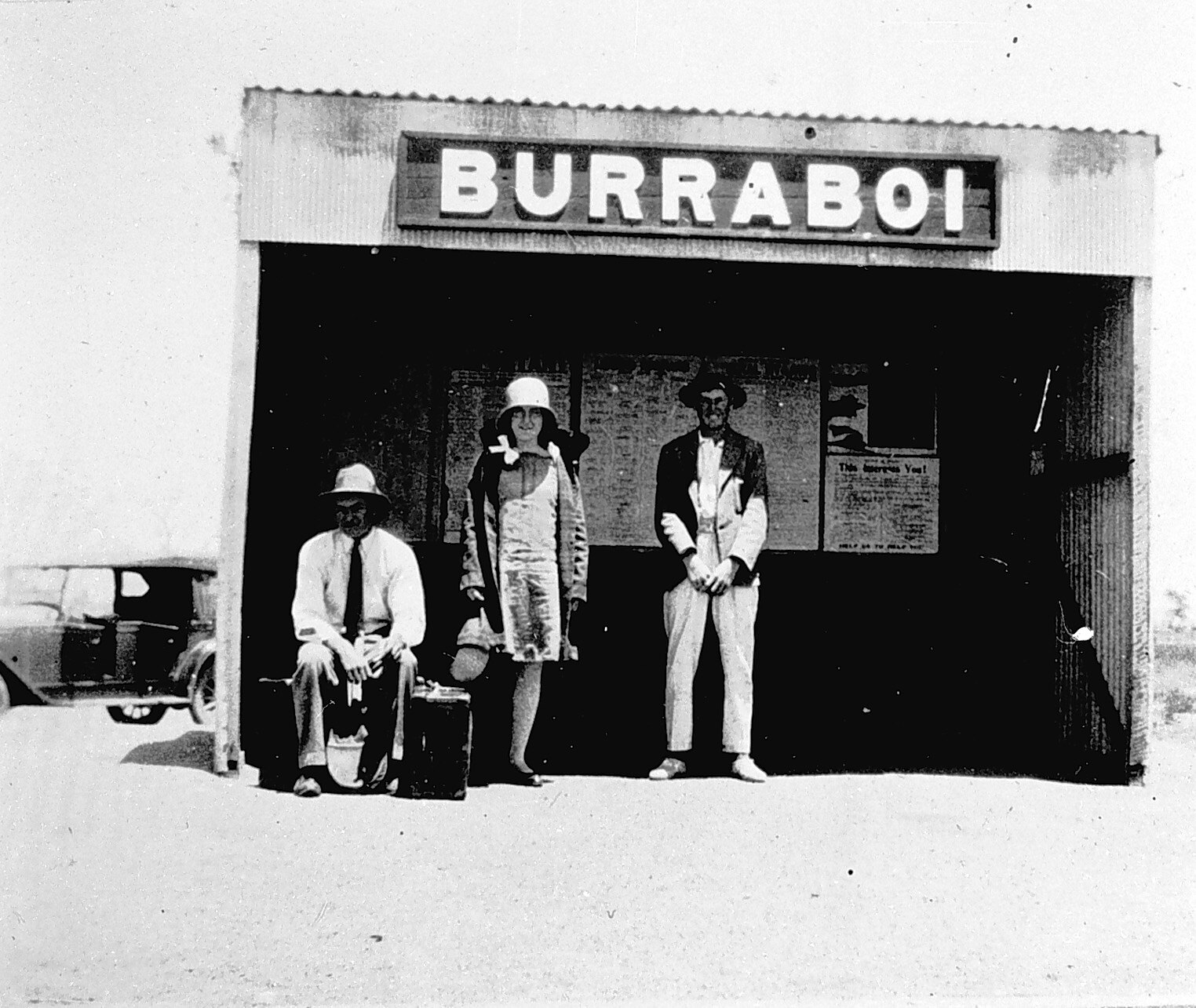 Two men and a woman in the railway shelter at Burraboi Railway Station. There is a car in the background.