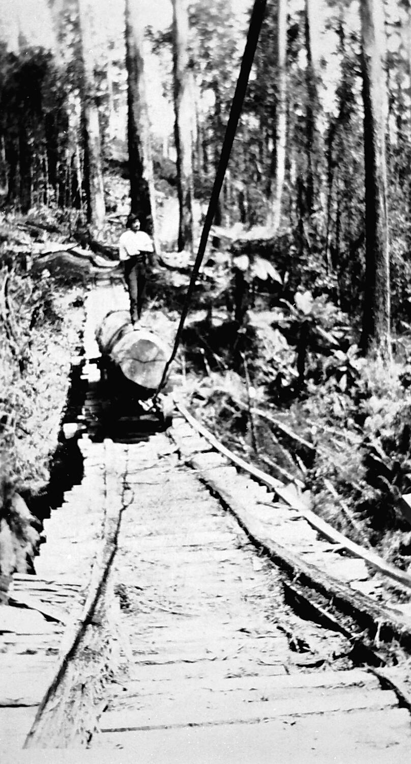A man standing on a log on a railway. The tracks run across a bridge.
