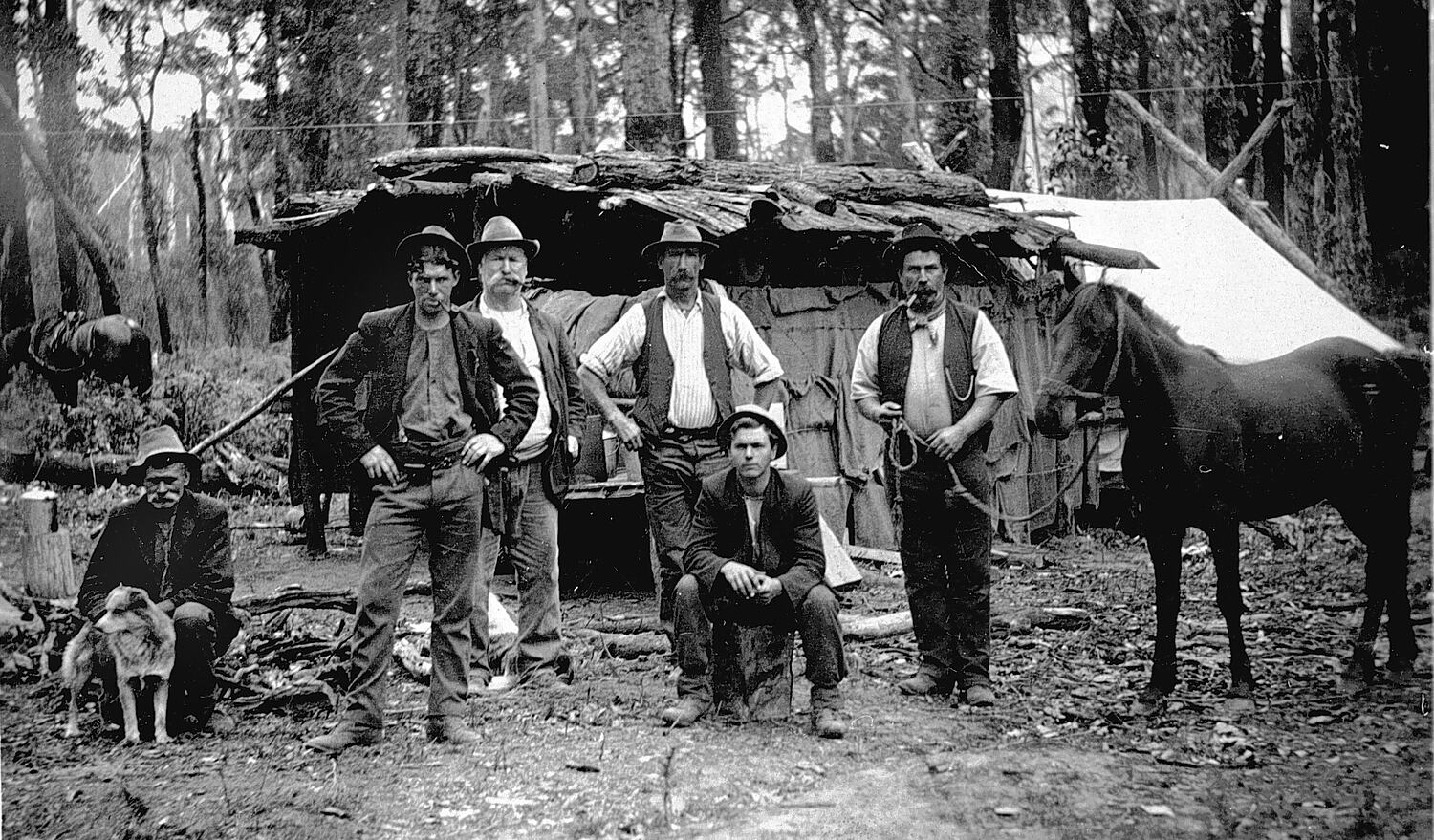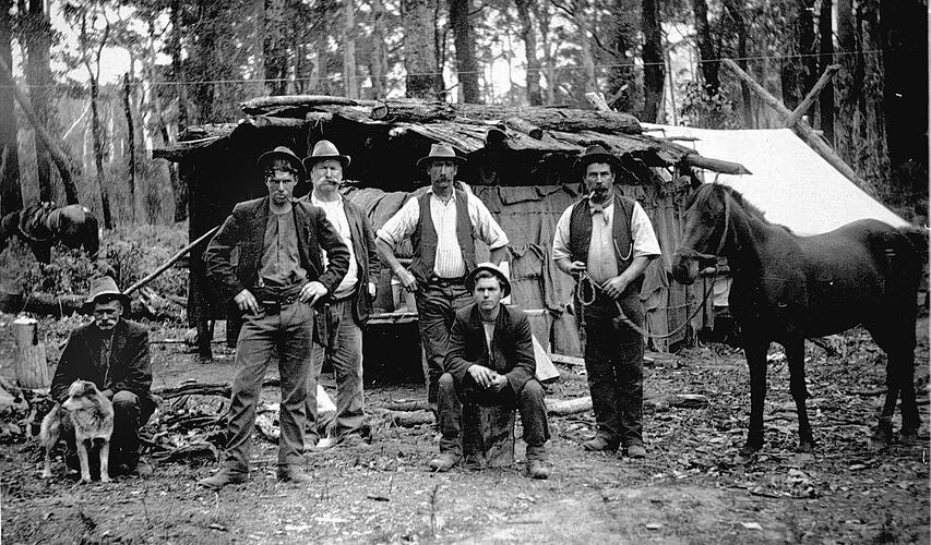 A group of men in front of a slab hut with tent attached. The man on the left holds a dog and the one on the right a horse. This was at Camm 's camp at Simpson's Creek on the Orbost-Bairnsdale line.
