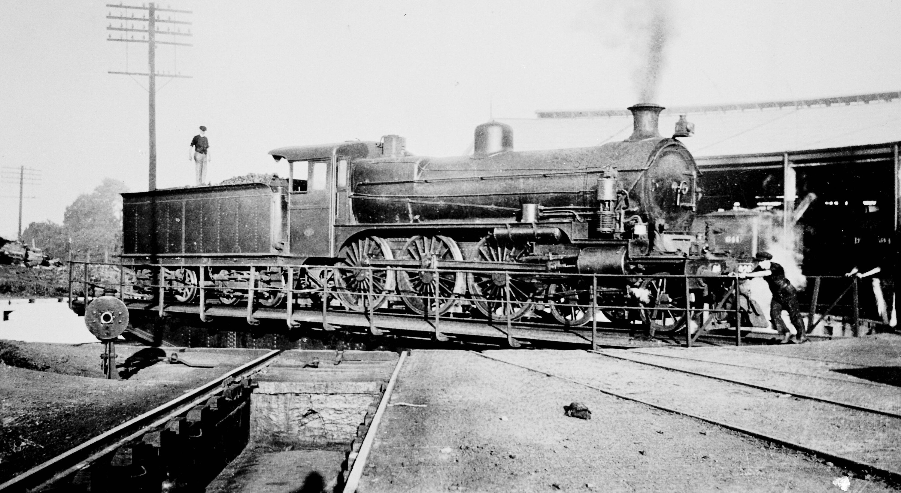 Negative of a train on the turntable at Traralgon Railway Station, circa 1925.