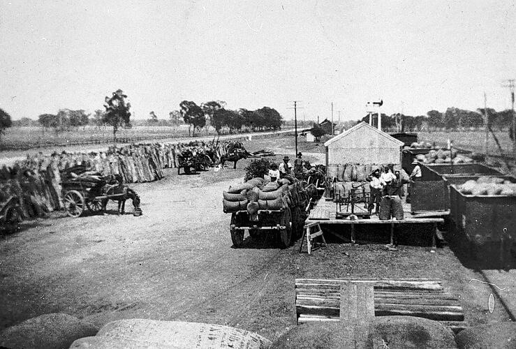 Men loading bags of grain onto a train.
