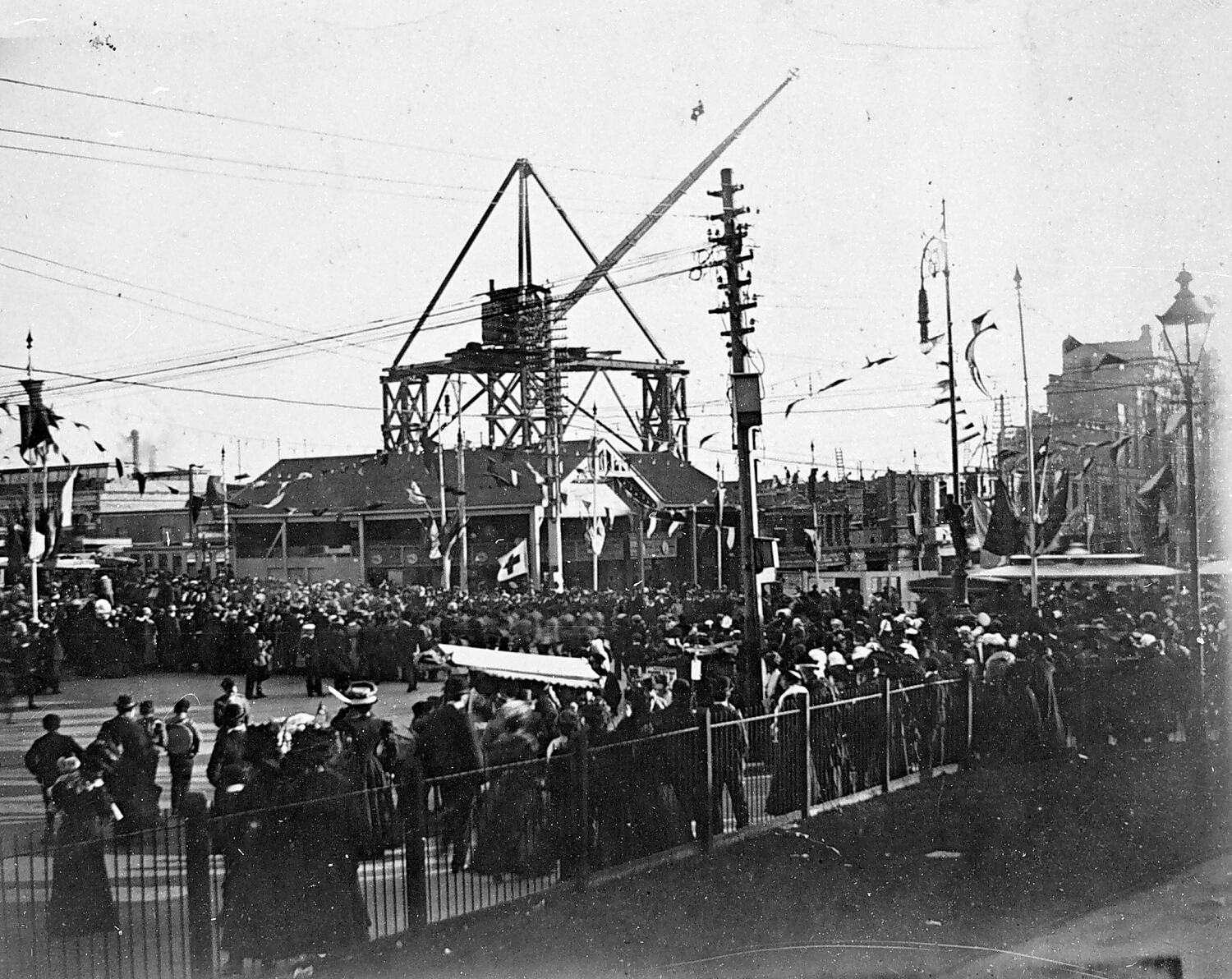 Construction of Flinders Street Railway Station. There is a large crane on a platform in the background. There are large crowds lining Swanston Street and bunting on poles.