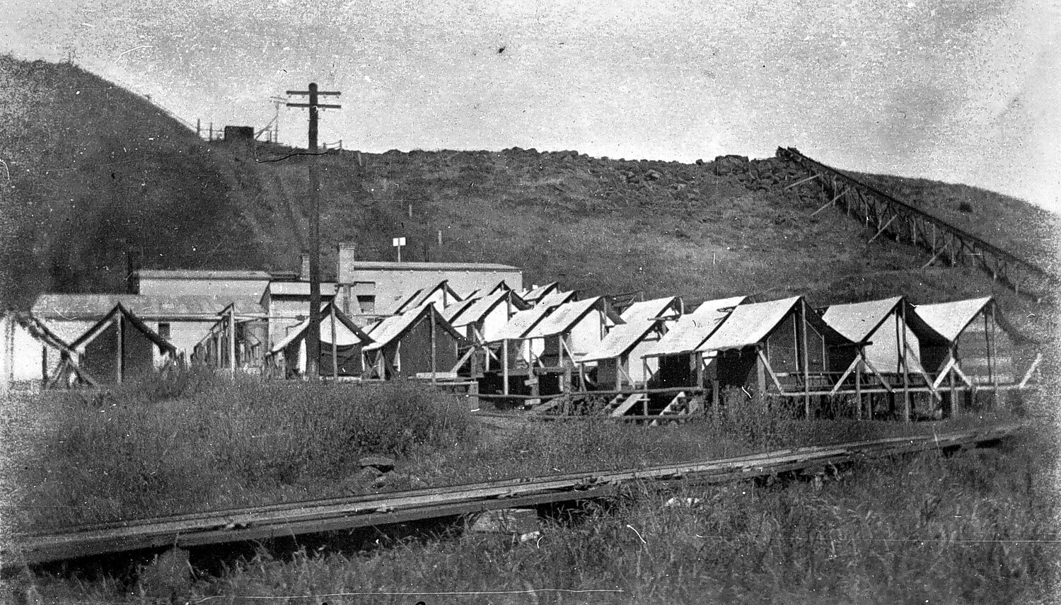 The Moorabool railway camp. There is a structure coming down the hill on the right and across the foreground. It may be a water race.