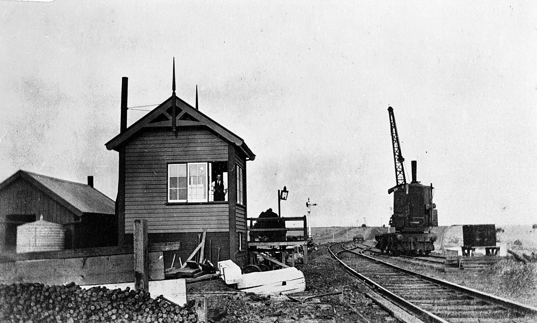 A signal box. There is a steam crane on the right.