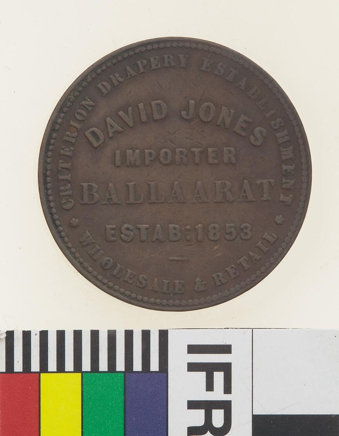 Obverse: DAVID JONES IMPORTER BALLAARAT ESTAB:1853 CRITERION DRAPERY ESTABLISHMENT WHOLESALE & RETAIL Reverse: CRITERION HOUSE DAVID JONES PROPRIETOR STURT ST., BALLAARAT 1862