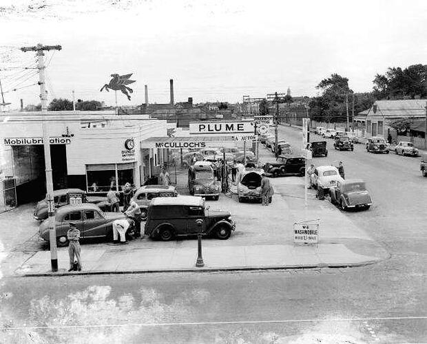Fuel Pumps, Motor Cars, Motor Garages, Parking Meters, Power Lines, Power Poles, Service Stations, Signage, Transport Workers