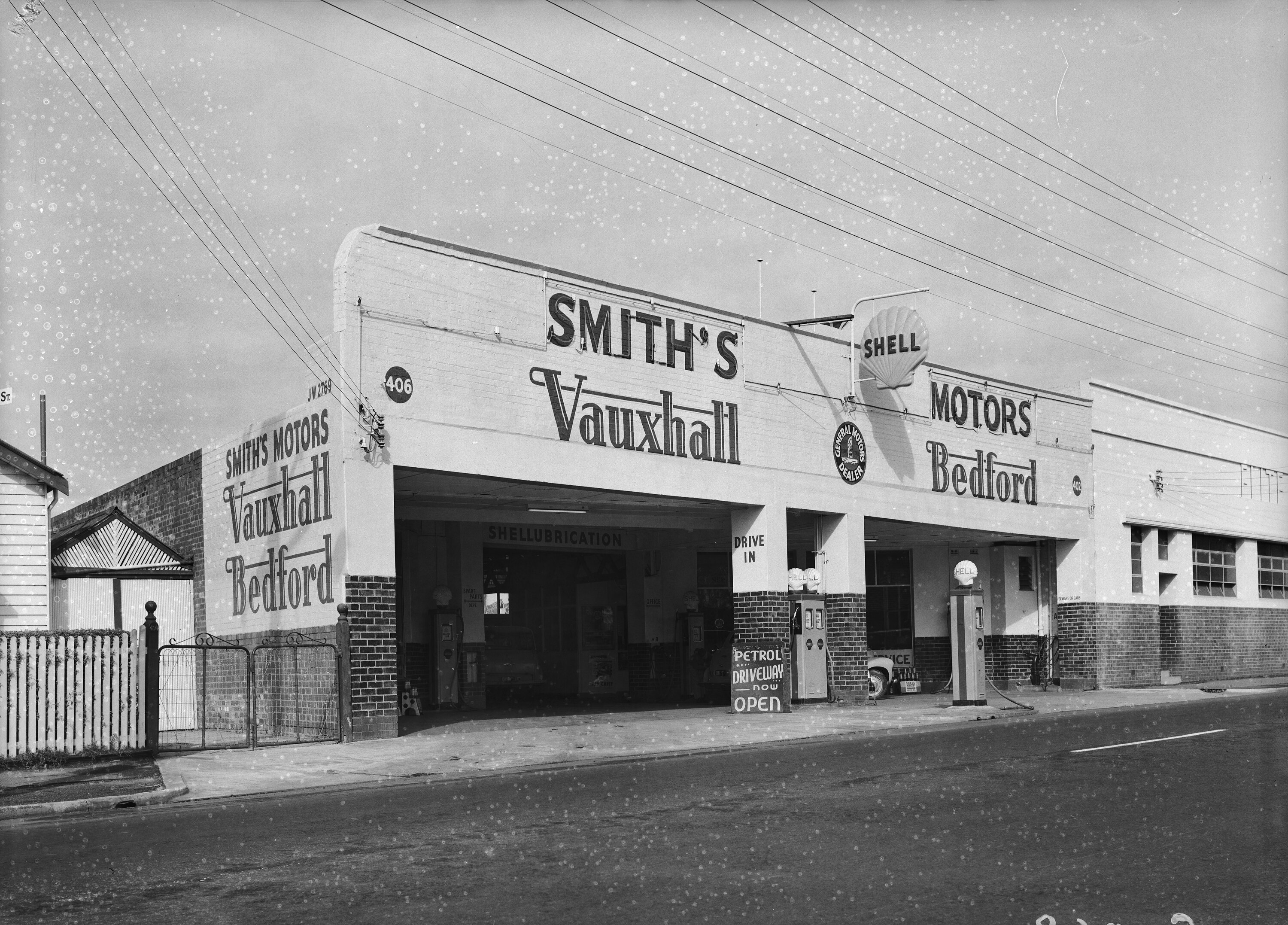 The exterior of a motor garage, showing the entrance, service areas, and a number of shell petrol bowsers. A weatherboard house is located next door.