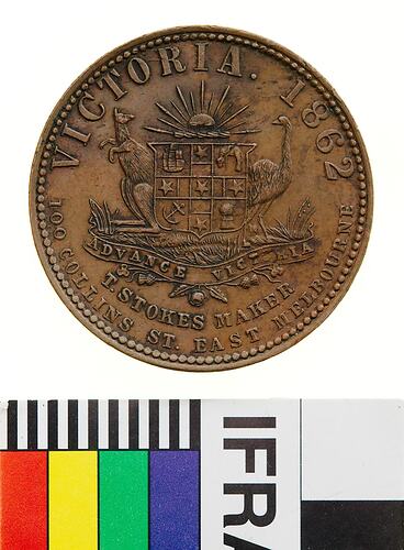 Coat of arms consisting of a central shield set on grass covered ground and below Rising Sun. On left a kangaroo seated facing out but head back towards sun (sejant sinister reguardant) and on right emu with similar stance (passant dexter reguardant). Below ground line and set on bouquet of rose, thistles and shamrock, a ribbon with the motto ADVANCE VICTORIA. The shield is quartered by a cross with a star at the centre and at the end of each arm. The cross is not shaded. The quarters contain: top left, a three-masted sailing ship; top right, a golden fleece; bottom left, an anchor; and bottom right, a wheat sheaf. Around above, VICTORIA . 1862 around below in two lines, T. STOKES MAKER / 100 COLLINS ST. EAST MELBOURNE. The neck of the emu is poorly engraved with additional line to the left, the T of EAST is below the letters AK of MAKER. The standard references for the die used to make this token are: Andrews 13 = Heyde Arms 5 = Sharples Arms 6.