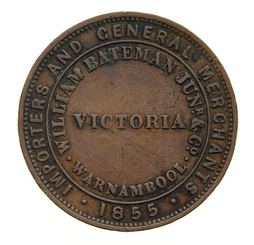 Obverse: WILLIAM BATEMAN JUNR. & CO. WARNAMBOOL VICTORIA IMPORTERS AND GENERAL MERCHANTS 1855 Reverse: AUSTRALIA