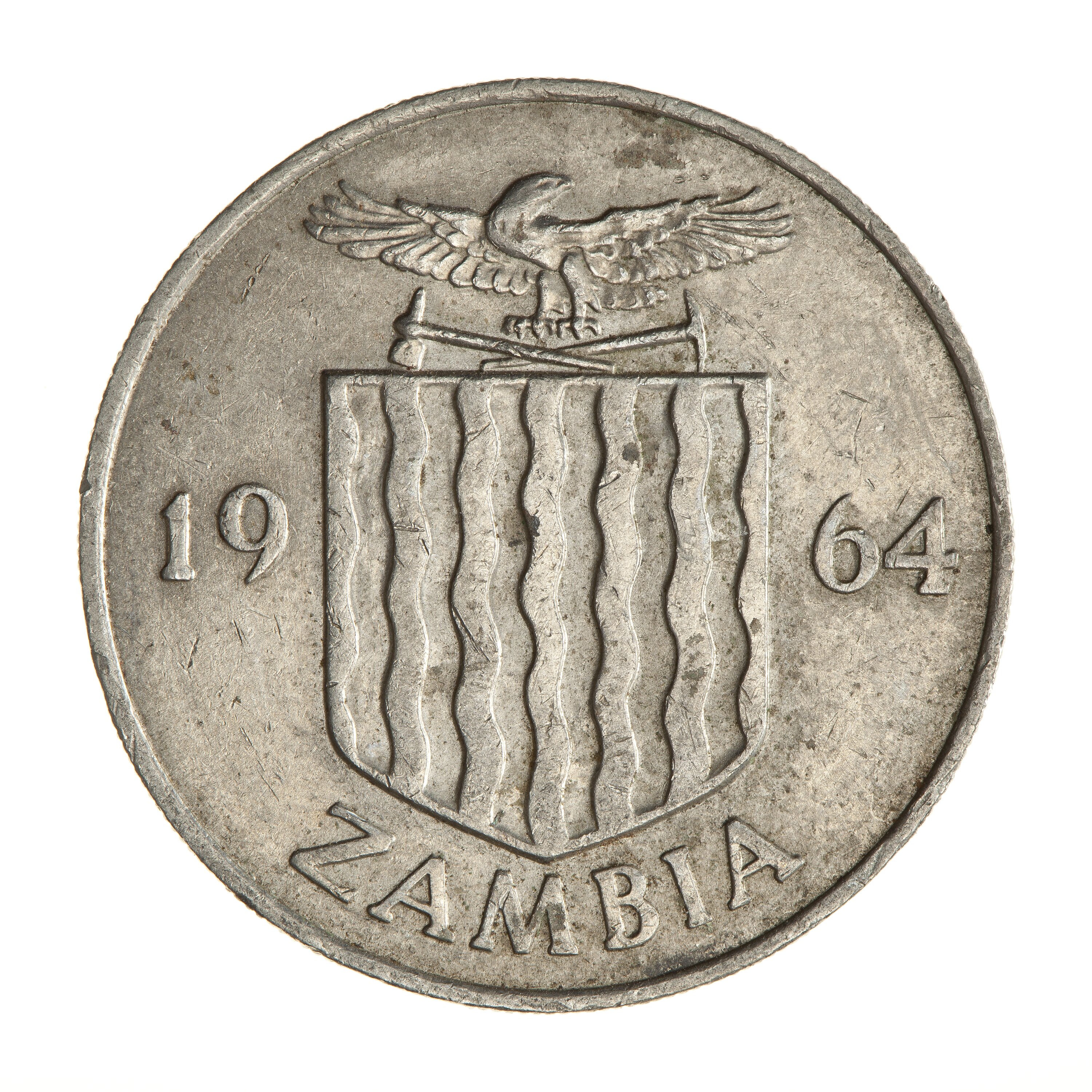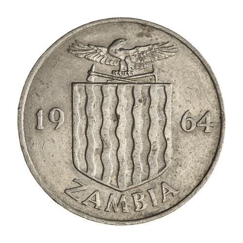 Coat of arms with eagle crest dividing the date 1964; below, ZAMBIA