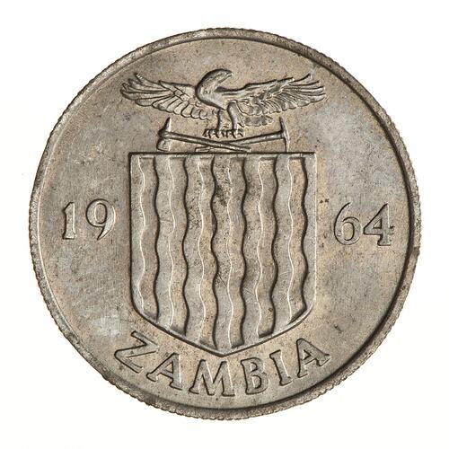 Coat of arms with eagle crest dividing the date 1964; below, ZAMBIA