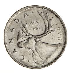 At centre, the head of a caribou facing left, between antlers in two lines, 25 / CENTS; around CANADA 1976; artist's initial, H, in field to left of moose neck