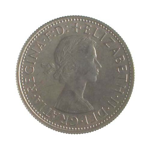 A silver coin (28 mm diameter with milled edge) featuring on the obverse a laureate bust of Elizabeth II facing right; around, ELIZABETH II . DEI . GRATIA . REGINA . F:D: + The artist's initials M.G. incuse on the bust truncation above the G of GRATIA. The reverse is based on the arms of the Commonwealth of Australia, as authorised by Royal Warrant 19 September 1912 - composed of a shield divided into six parts, each containing a representation of the badge of a State (although that of South Australia is depicted as three sheaves of wheat above a rising sun instread of the authorised Piping Shrike). The shield is supported by a kangaroo and an emu standing on a grassy mound accompanied by small branches of wattle. Above the shield is a crown instead of the Federation star. Around above, FLORIN between two seven pointed stars; and below, in the exergue, the date, 1957 curved below which, AUSTRALIA. The artist's initials KG are in the field above the back of the emu.