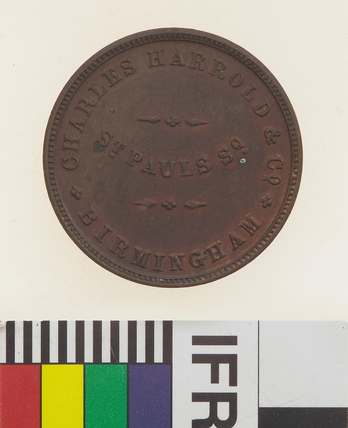 A round copper token (28 mm diameter). The token features the name address and buisness of the issuer: Charles Harrold & Co. St. Pauls Square, Birmingham; and the statement "Refined Australian copper for alloying gold".