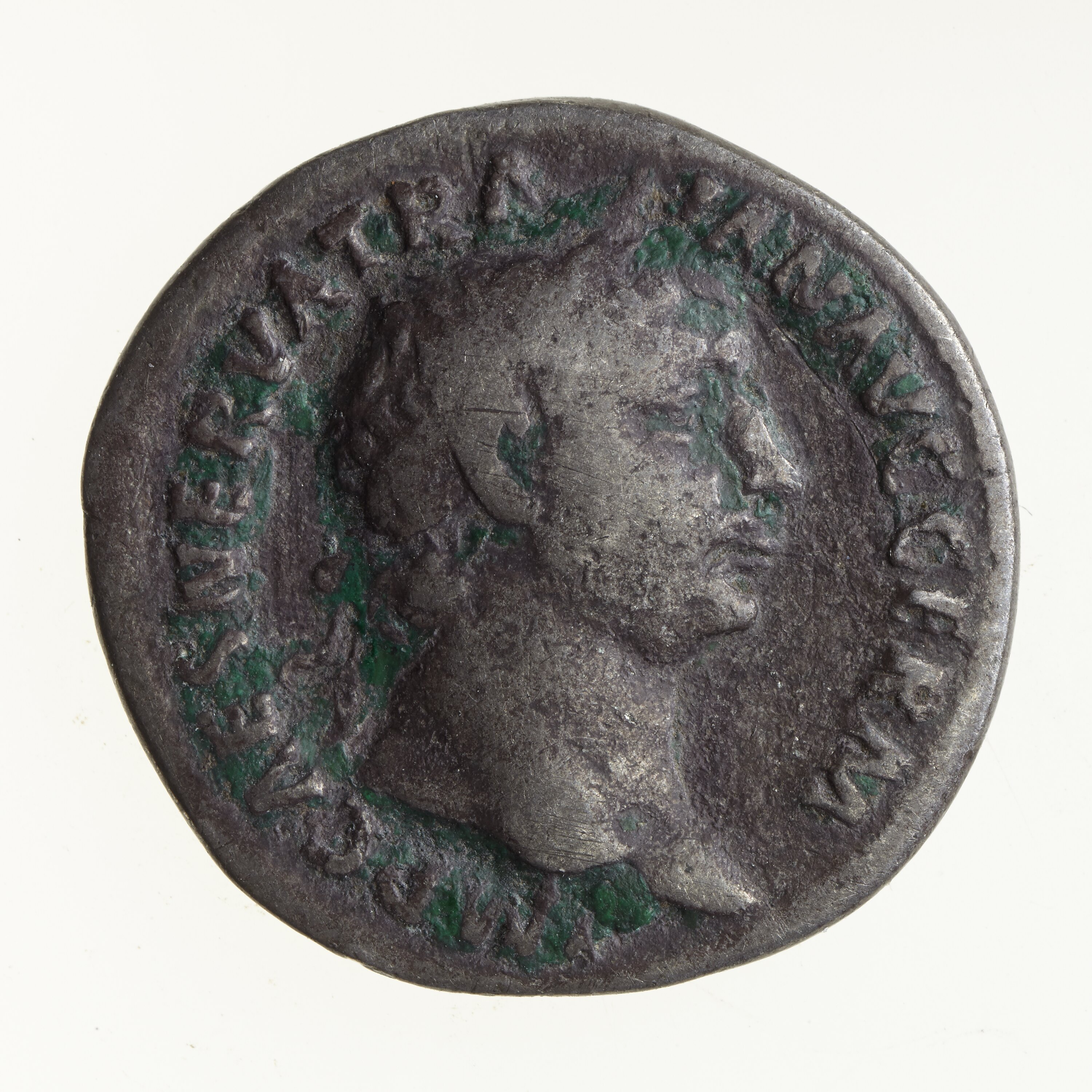 Laureate head of Trajan facing right; around, IMP CAES NERVA TRAIAN AVG GERM
