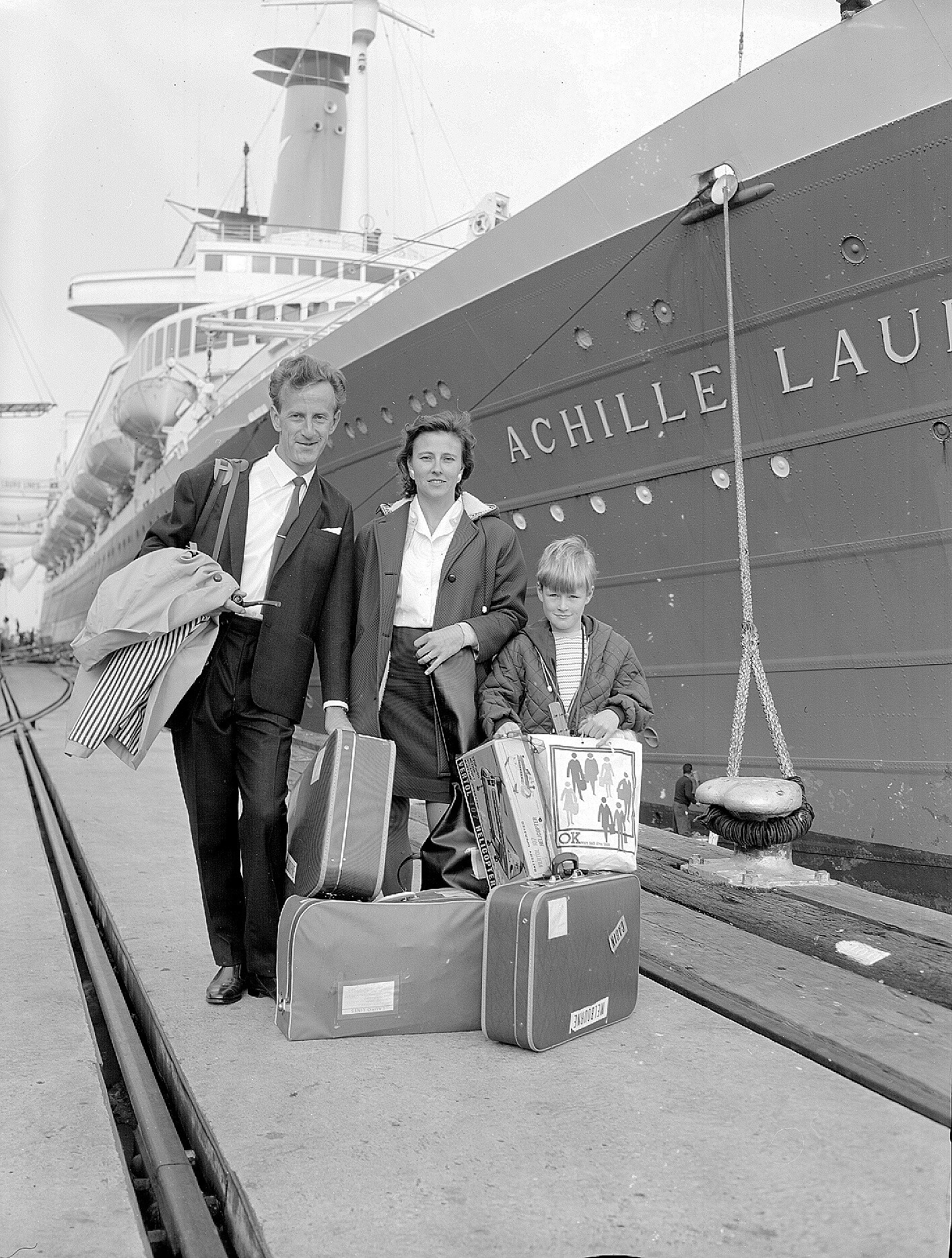 A man, woman and a young boy standing on Station Pier, Port Melbourne, having arrived on the ocean liner `Achille Lauro'. They are carrying several suitcases and a toy helicopter set.