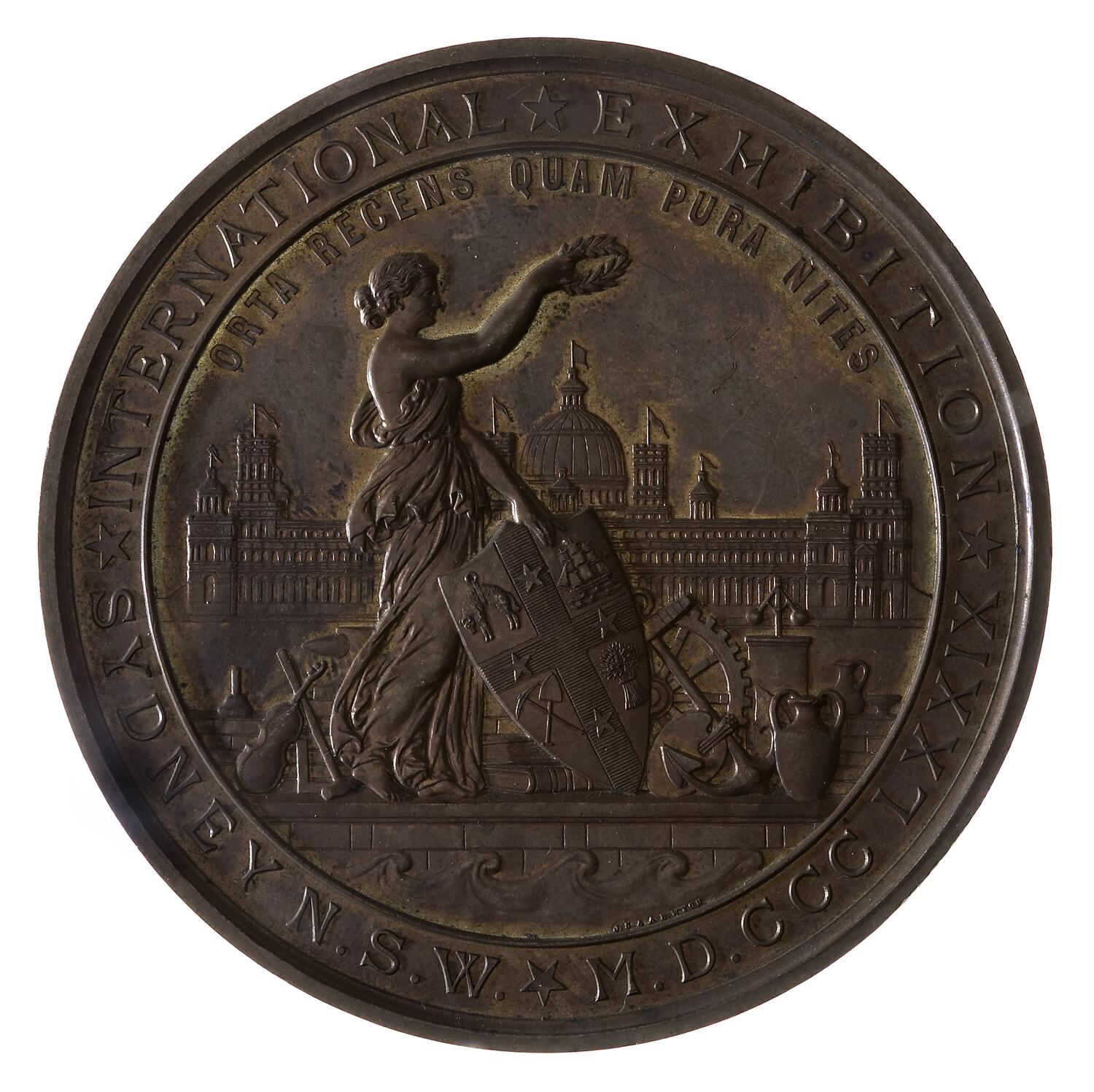 A large bronze prize medal (76 mm) featuring a view of the Sydney Garden Palace Exhibition Building with a figure of New South Wales standing in front holding the colonial shield and surrounded by exhibition goods.