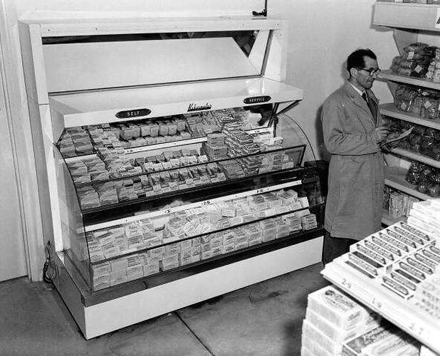 Self service Kelvinator refrigerator and worker at a grocery shop in Bentleigh, Victoria, 1953. Photograph commissioned by Frigrite.