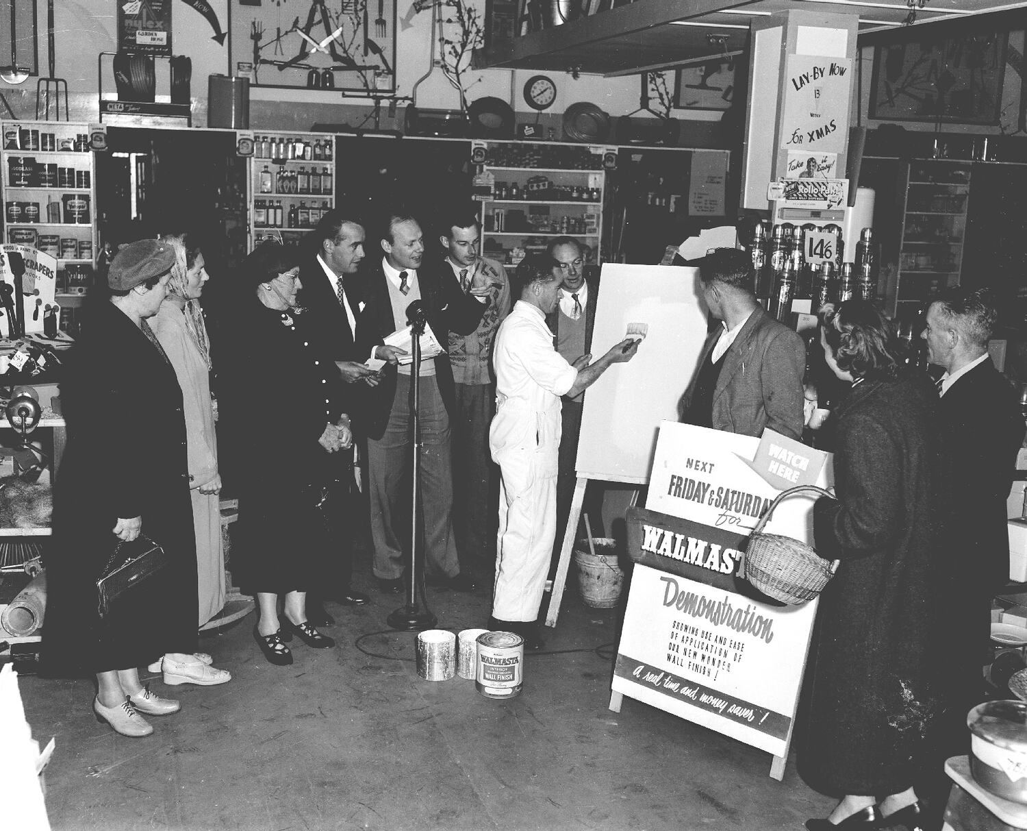 Group of people watching a Walmaster paint demonstration in a hardware store, Bentleigh. A man in a boiler suit is applying paint by brush to a sheet of timber.
