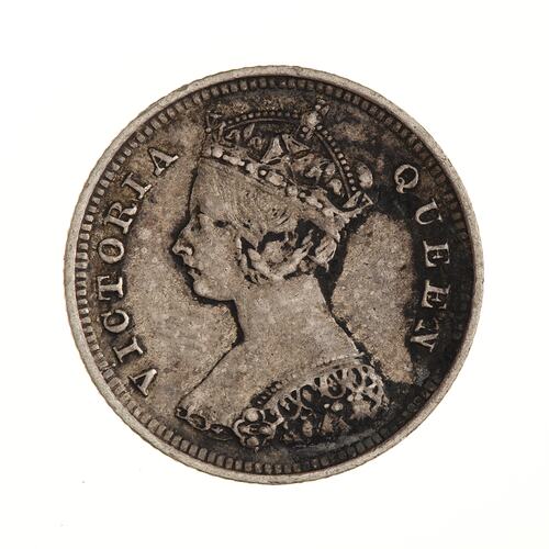 The 10 cent denomination was introduced in 1863, struck at the Royal Mint, London until 1866. Between 1866 and 1868 the coins were struck at the Hong Kong mint but production returned to Britain after the closure of that mint to be shared betwee the Royal Mint and Hearton & Sons, Birmingham.