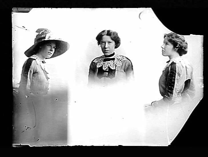 Glass plate negative depicting three portraits of a woman, possibly taken by Melbourne photographer, Mr Robert Harvie.
