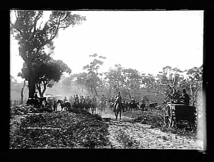 Glass plate negative of a cavalry of soldiers on horses travelling along a road, taken by Melbourne photographer, Mr Robert Harvie's studio Harvie & Sutcliffe.